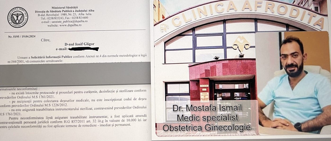 Grave nereguli constatate la Afrodita Sebes, clinica administrata de ginecologul Mostafa Ismail! In urma unui control efectuat de inspectorii DSP Alba, acestia au consemnat mai multe neconformitati ( Adresa nr 5195/19.04.2024). Potrivit procesului verbal de contraventie, nu existau intocmite protocoale, proceduri pentru curatenie, dezinfectie si sterilizare, conform prevederilor Ordinului M.S 1761/2021, pe recipientii pentru colectarea cleieurilor medicale nu era inscriptionat codul de de>eu conform prevederilor Ordinului M.S 1226/2012 si nu era asigurata trasabilitatea instrumentarului sterilizat, contravenind prevederilor Ordinului M.S 1761/2021. (vezi foto)Pentru neconformitatea lipsa asigurare trasabilitate instrumentar, a fost aplicata amenda contraventionala persoana juridica conform H.G 857/2011 art. 32 lit.g in valoare de 10.000 lei iar pentru celelalte neconfomitati au fost aplicate termene de remediere – imediat si permanent.Ginecologul Mostafa Ismail lucreaza cu carte de munca la Spitalul Orasenesc Cugir, dar este administrator si asociat in SC Afrodita KRM SRL, societate care administreaza cele doua clinici Afrodita, din Sebes si Orastie.De mentionat ca Mostafa Ismail a mai fost amendat de inspectorii DSP Alba (vezi aici – https://alba.transilvania-tv.ro/ginecologul-mostafa-ismail-amendat-cu-3-000-de-lei-in-cazul-iuliei-kulksar-cercetarile-continua/) in cazul Iulie Kulcsar, pacienta de 25 de ani care a murit dupa ce a intrat intr-o coma profunda. De asemenea, Mostafa este cercetat in patru dosare penale, deschise in judetele Alba si Hunedoara (Vezi aici – https://alba.transilvania-tv.ro/iata-dovezile-patru-dosare-penale-pentru-doctorul-mostafa-ismail-confirmate-oficial-avocatul-poporului-si-colegiul-medicilor-confirma-si-ele-cercetarile-inca-o-plangere-penala-si-o-sesizare-la-col-2/)(Foto Facebook)
