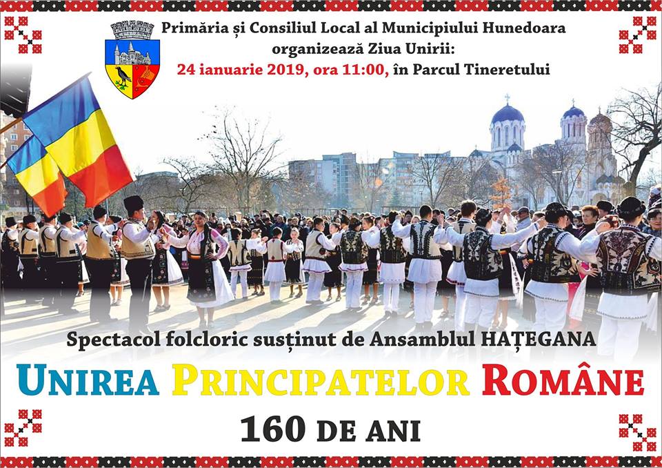 Primăria Municipiului Hunedoara organizează joi, 24 ianuarie 2019, cu ocazia împlinirii a 160 de ani de la Unirea Principatelor Române, un spectacol de dans și muzică populară susținut de Ansamblul de Cântece și Dansuri „Hațegana”.