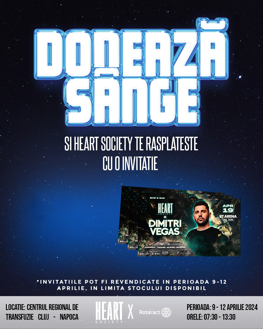 În perioada 9-12 aprilie are loc o campanie de donare de sânge la Centrul Regional de Transfuzie din Cluj-Napoca. Astfel, cei care donează în această perioadă, pe lângă tichetul de 280 de lei și o zi liberă de la muncă, vor primi o invitație la Heart Society x Dimitri Vegas care va avea loc la BT ARENA, în data de 19 aprilie.
