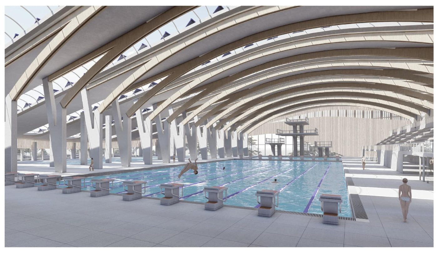Proiectul prevede construirea unei clădiri pe 3 niveluri cu un bazin de înot acoperit, capacitate de 1000 de spectatori și zone dedicate competițiilor sportive de natație. Sunt cuprinse: bazin olimpic de înot, bazin olimpic de sărituri, zonă de gradene pentru spectatori, zone de agrement, bazin de inițiere, saune, jacuzzi, vestiare și zonă administrativă.