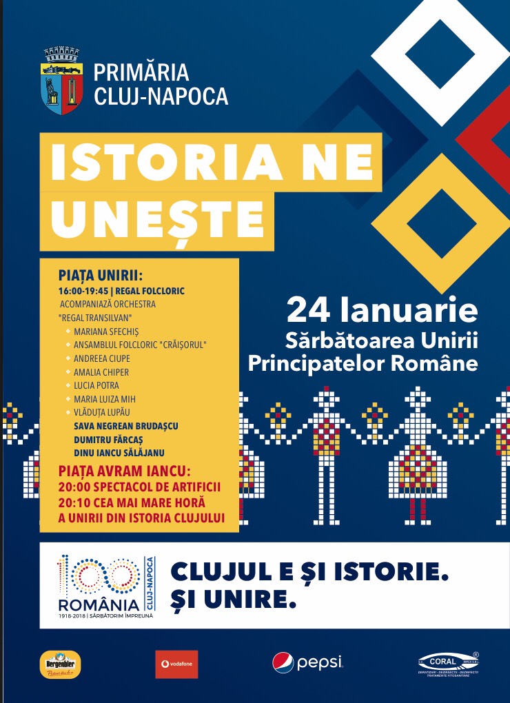 Primăria municipiului Cluj-Napoca organizează, miercuri, 24 ianuarie 2018, în Piața Unirii și în Piața Avram Iancu, un spectacol dedicat sărbătoririi a 159 de ani de la Unirea Principatelor Române.