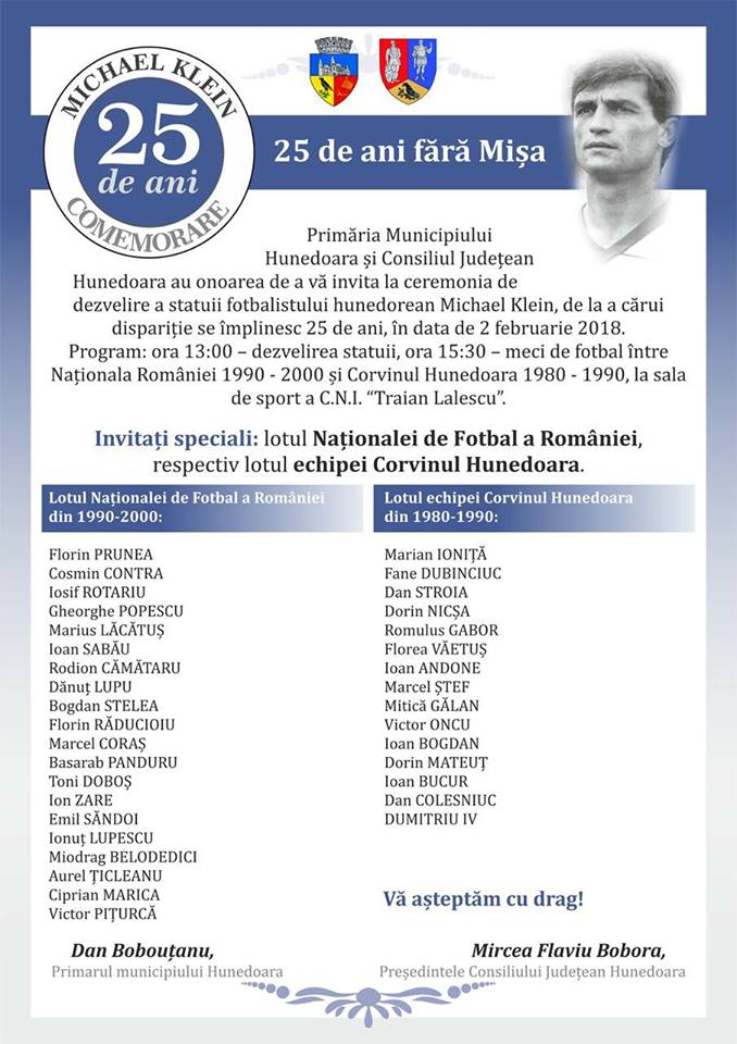 Primăria Municipiului Hunedoara și Consiliul Județean Hunedoara au onoarea de a vă invita la manifestările prilejuite de comemorarea fotbalistului hunedorean Michael Klein.