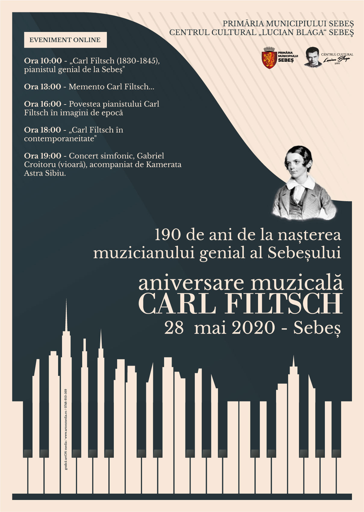 Joi, 28 mai 2020, Primăria Municipiului Sebeș, prin Centrul Cultural „Lucian Blaga” Sebeș, organizează un eveniment dedicat memoriei muzicianului Carl Filtsch (1830-1845), cu ocazia aniversării celor 190 de ani de la nașterea sa. Adaptat contextului actual, evenimentul se va desfășura în mediul online, pe pagina de facebook a Centrului Cultural „Lucian Blaga” Sebeș și va cuprinde materiale documentare privind biografia muzicianului, fotografii și documente de epocă, precum și două momente muzicale. Evenimentul online se va derula după următorul program: Ora 10:00 – „Carl Filtsch (1830-1845), pianistul genial de la Sebeș” (materiale biografice, accesibile pe pagina de facebook a Centrului Cultural „Lucian Blaga” Sebeș). Ora 13:00 – Memento Carl Filtsch… Ora 16:00 – Povestea pianistului Carl Filtsch în imagini de epocă (accesibile pe pagina de facebook a Centrului Cultural „Lucian Blaga” Sebeș). Ora 18:00 – „Carl Filtsch în contemporaneitate” – un proiect inedit, susținut de Eduard și Victor Schneider. Interpretează pianistul Ovidiu Pârjol (accesibil pe pagina de facebook a Centrului Cultural „Lucian Blaga” Sebeș). Ora 19:00 – Concert simfonic, Gabriel Croitoru (vioară), acompaniat de Kamerata Astra Sibiu. În program: Antonio Vivaldi, „Anotimpurile pentru vioară și orchestră de coarde, op. 8” și Wolfgang Amadeus Mozart, „Mica serenadă în Sol major, KV 525” (retransmiterea concertului desfășurat la 25 mai 2018, prin intermediul paginii de facebook a Centrului Cultural „Lucian Blaga” Sebeș). Carl Filtsch s-a născut la 28 mai 1830, la Sebeș, fiind considerat unul dintre cei mai mari pianiști ai secolului al XIX-lea și cel mai strălucit discipol al marilor compozitori Frederic Chopin și Franz Liszt. Deși s-a stins la o vârstă fragedă (15 ani), răpus de tuberculoză, Carl Filtsch a desfășurat o activitate extrem de bogată, cu reprezentații pe marile scene ale Europei (Budapesta, Viena, Wiesbaden, Baben-Baden, Paris, Londra), apreciate de revistele de specialitate ale epocii, dublate de propriile creații muzicale (13 la număr).Evenimentul este organizat de Primăria Municipiului Sebeș și Centrul Cultural „Lucian Blaga”Sebeș.