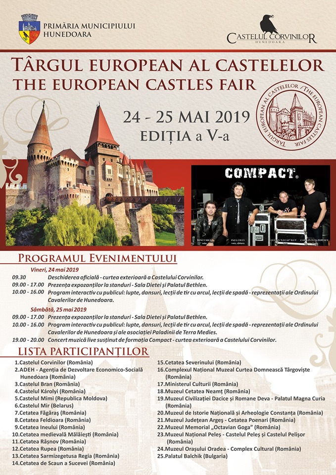 Primăria Hunedoara și Muzeul Castelul Corvinilor vă invită în perioada 24 – 25 mai 2019 la cea de-a cincea ediție a Târgului European al Castelelor, un eveniment unic în România care doreşte să promoveze frumuseţea monumentelor istorice din țară și din Europa.