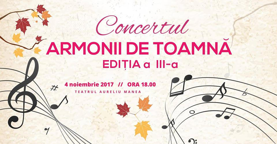 Primăria Municipiului Turda si Casa de Cultură Turda organizează Concertul Coral Armonii de Toamnă, ajuns la a III-a ediție. Știriul va avea loc sâmbătă, 4 noiembrie, ora 18,00 la Teatrul Aureliu Manea, iar în program vor evolua ansamblurile corale PASTORALA din Focșani, PSALMODIA TRANSYLVANICA din Cluj-Napoca, DORULEȚ din Ocna Mureș, ASTRA din Câmpia Turzii și ARMONIA din Turda.