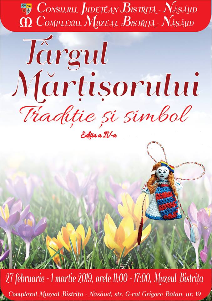 Complexul Muzeal Bistriţa-Năsăud, organizează în perioada 27 februarie – 1 martie, între orele 11 – 17, a IV- a ediţie a târgului de Mărţişor „Tradiţie şi simbol”, eveniment ce va avea loc în incinta Muzeului Bistriţa din strada Gen. Grigore Bălan, nr. 19.