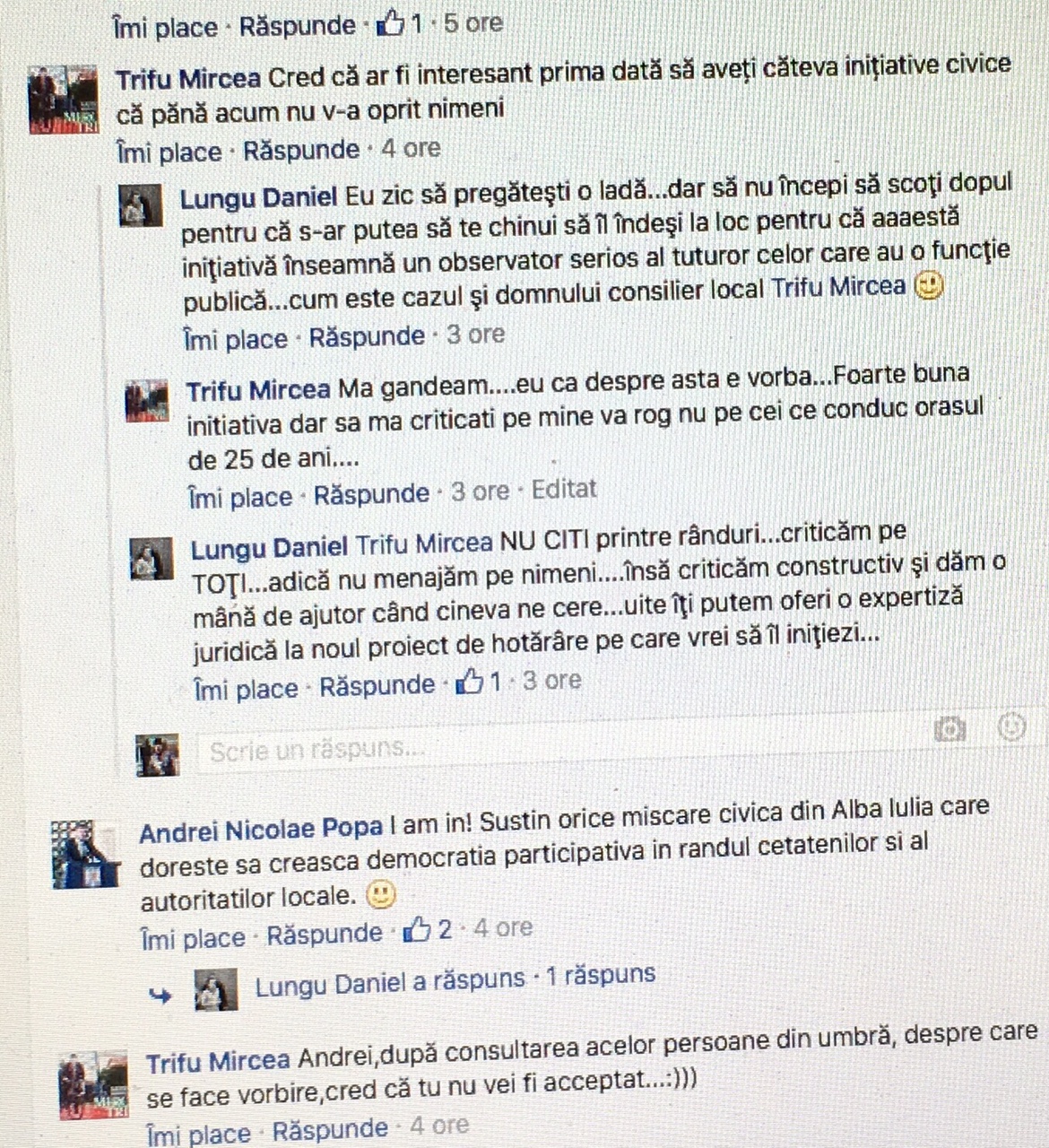 Am crezut ca nu vad bine! Am citit si recitit pe Facebook cateva dialoguri, cu sarje amicale, referitoare la infiintarea Grupuiui Societatii Civile Alba, un grup care, citez:,, va încerca să participe activ la tot ceea ce înseamnă dezbaterea unor proiecte, decizii şi măsuri importante pentru comunitate, să disemineze activitatea administrativă şi instituţională…o iniţiativă care vrea să stimuleze implicarea activă a cetăţenilor în luarea deciziilor care ii privesc direct şi SĂ TREZEASCĂ din amorţeală societatea civilă. ”Pana aici toate bune dar… Aflam cu stupoare ca membrii acestui grup sunt ,,in umbra”, (probabil din cauza caniculei), adica sunt secret de stat, de serviciu etc. nimeni nu stie cine sunt si nici nu vom afla probabil vreodata! Si mai aflam ca, iar citez:,,Criticam pe TOTI…adica nu menajam pe nimeni…” Pai, domnii mei, de critica avem noi nevoie in tara asta? Nu ne criticam de ne sar fulgii, de aproape 30 de ani si…?! Chiar daca e buna uneori si ,,umbra”, as vrea sa vad, in acest caz, niste oameni curajosi ,,la soare”, cu probitate morala, nu slugile unor politicieni compromisi. Sper ca nu-i suparare si ca nu v-am luat painea de la gura pentru ca, eu am inceput deja sa-i critic ,,pe TOTI”! Cu respect, Iosif Gligor.
