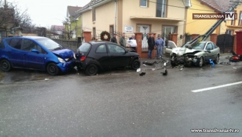 Se pare că o doamnă a vrut să iasă cu un Suzuki din curtea unei case fără să se asigure, iar mașina ei a fost lovită de un Opel care venea în viteză și, în urma impactului, a fost proiectat într-un stâlp de înaltă tensiune, nu înainte de a avaria și alte două mașini.