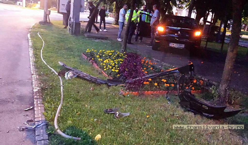 Sătmăreanul a proiectat mașina parcată în terasa aăturată, distrugând și un stâlp de beton destinat rezervării parcării. După care bolidul a intrat peste rondul de flori direct în parc, oprindu-se într-o bancă.