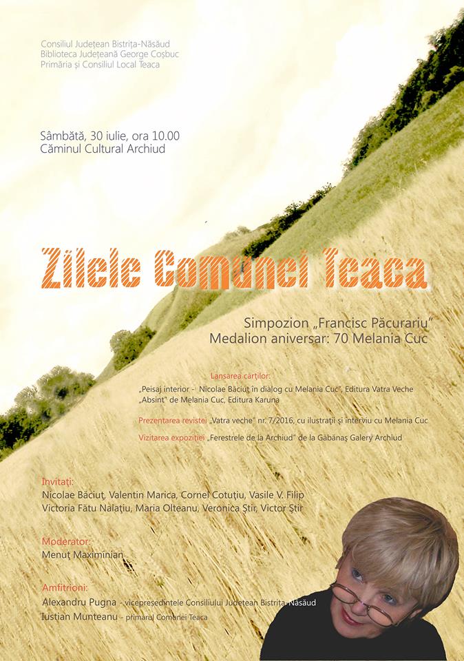 Consiliul Județean Bistrița-Năsăud, Biblioteca Județeană „George Coșbuc”, Primăria și Consiliul Local Teaca organizează sâmbătă, 30 iulie, ora 10:00, la Căminul Cultural Archiud, cu ocazia Zilelor Comunei Teaca, următoarele evenimente culturale: