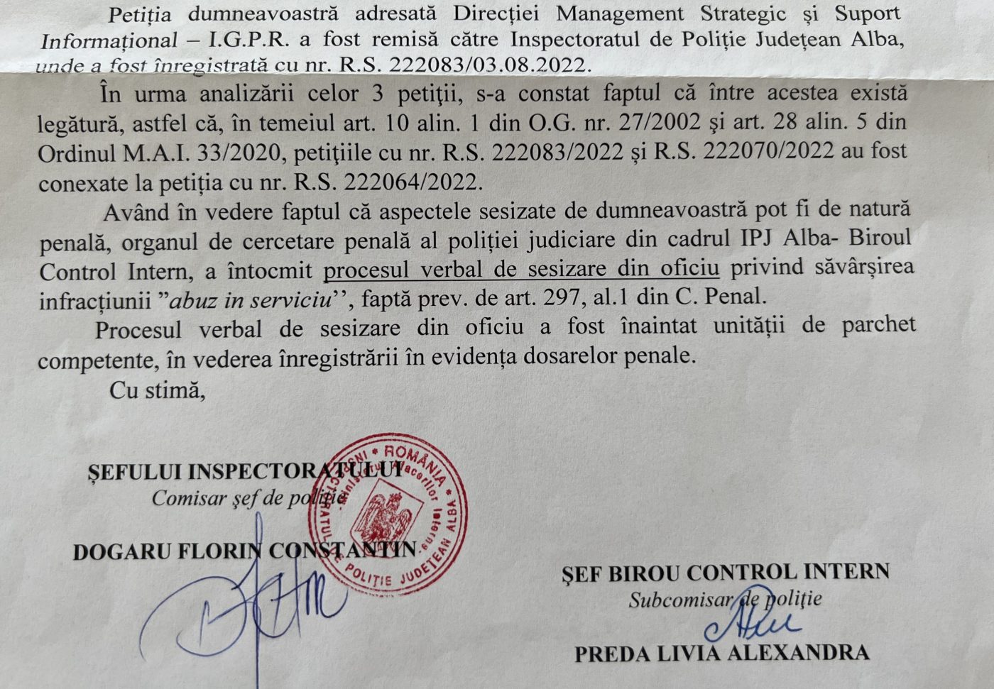 Unii dintre politistii din judetul Alba profita de uniforma si de functia pe care o au! Este si cazul Ag Sef Boca Adrian care a amendat abuziv un localnic din Sebes ce a reclamat galagia si muzica din oras, de la miezul noptii. Probabil ca politistul a incercat astfel sa-l intimideze pe reclamant si pe cei ca el, care au ,,curajul” sa-l deranjeze cu astfel de sesizari. IPJ Alba- Biroul Control Intern ,,a intocmit procesul verbal de se sesizare din oficiu pentru savarsirea infractiunii ,,abuz in serviciu” (vezi foto) si a sesizat procurorii pentru ca Ag. Sef Boca Adrian de la Politia Sebes sa fie cercetat penal. Politistul a abuzat de functia sa si a incheiat abuziv procesul verbal 054040/14.07.2020 , in care precizeaza ca in noaptea de 14.07.2022 la ora 22,54 a fost solicitat sa intervina intr-un cartier din Sebes, unde era muzica, galagie, dar acesta (politistul) sutine si scrie ca: ,,in urma verificarilor nu s-a confirmat”. Reclamantul a fost amendat cu 500 de lei, chiar daca acesta (reclamantul) a prezentat doua inregistrari video din 14.07.2022, la ora 23,10 si 23,11, adica dupa 16 minute si 17 de minute de la sesizare, in care se aude clar galagia si muzica. Impotriva procesului verbal intocmit de Ag Sef Boca Adrian a fost depusa si o plangere contraventionala la Judecatoria Sebes. Localnicii din Sebes nu au nevoie de astfel de politisti si cer pedepsirea unor astfel de indivizi care, in loc sa respecte legea si sa fie in slujba cetateanului, folosesc haina de politist pentru a face abuzuri.