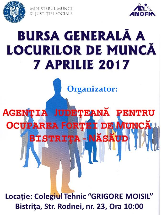 Agenţia Judeţeană pentru Ocuparea Forţei de Muncă Bistriţa – Năsăud va organiza în data de 7 aprilie 2017, începând cu ora 10,00, Bursa Generală a Locurilor de Muncă.