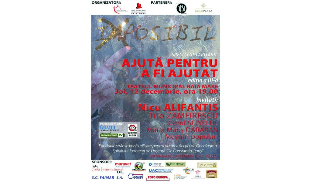 Sub genericul “Ajută pentru a fi ajutat!”, pe 12 decembrie 2013, la Teatrul Municipal Baia Mare va avea loc, cu începere la ora 19.00, un deosebit spectacol caritabil organizat de Asociaţia “Prietenii Spitalului” din Baia Mare.