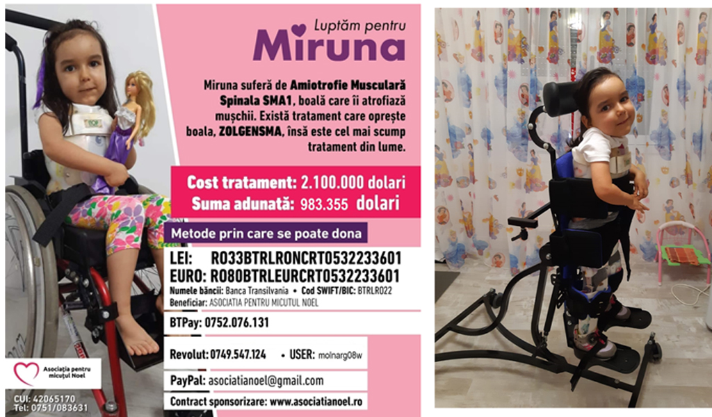 Miruna suferă de Amiotrofie musculară spinală, o boală genetică rară care îi atrofiază mușchii și îi distruge tot corpul. Tratamentul costă 2.100.000$ iar până în prezent s-au strâns 983.355$.
