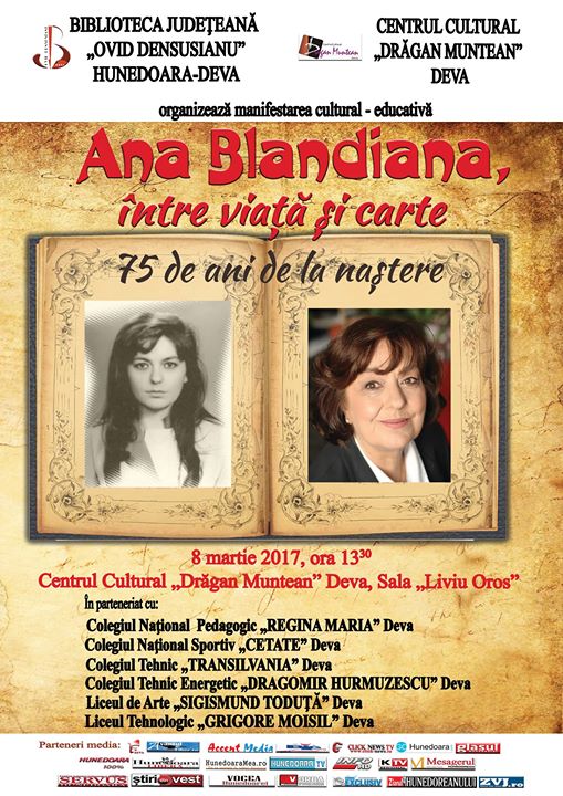 Biblioteca Județeană „Ovid Densusianu” Hunedoara-Deva organizează în ziua de 8 martie 2017, ora 13.30, la Centrul Cultural „Drăgan Muntean” Deva, Sala „Liviu Oros”, o manifestare cultural-educativă dedicată Zilei Internaționale a Femeii, eveniment în cadrul căruia se va prezenta medalionul „Ana Blandiana, între viață și carte – 75 de ani de la naștere”.