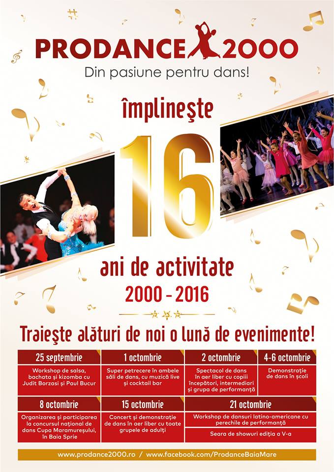 Prodance 2000 Baia Mare împlineşte 16 ani de activitate. Răstimp în care şcoala de dans s-a dezvoltat în permanenţă, diversificând numărul de servicii oferite şi crescând calitatea acestora, astfel încât fiecare moment petrecut sub cupola Prodance 2000 să devină o experienţă de neuitat. Şi pentru că motivele de celebrare sunt numeroase, sărbătoarea va ţine… o lună de zile!