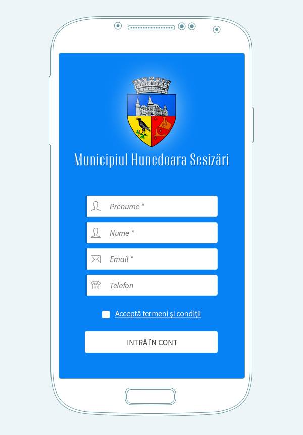 Prima pagină Aplicație mobilă “Municipiul Hunedoara Sesizări”, pentru raportarea sesizărilor de pe domeniul public