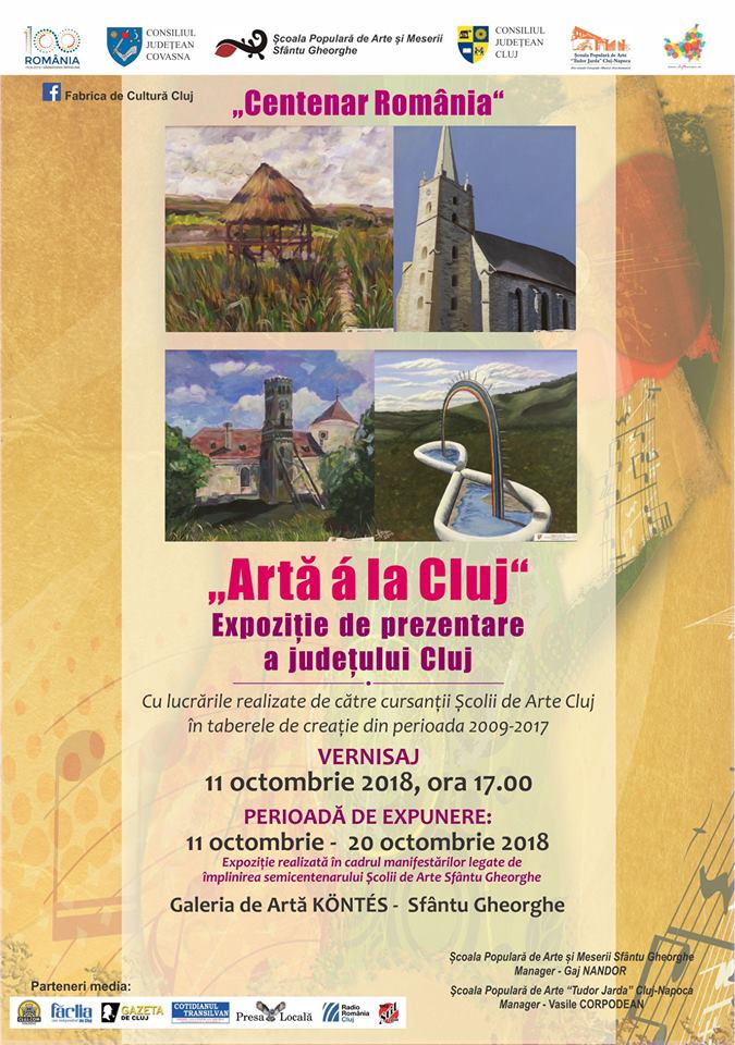 Sub egida „Centenar România” şi cu ocazia manifestărilor legate de împlinirea semicentenarului Şcolii de Arte Sfântu Gheorghe, Şcoala Populară de Arte „Tudor Jarda”, instituţie subordonată Consiliului Judeţean Cluj organizează, în perioada 11 octombrie – 20 octombrie a.c., la Galeria de Artă „Köntés” din Sfântu Gheorghe, expoziţia de prezentare a judeţului Cluj, „Artă á la Cluj”.