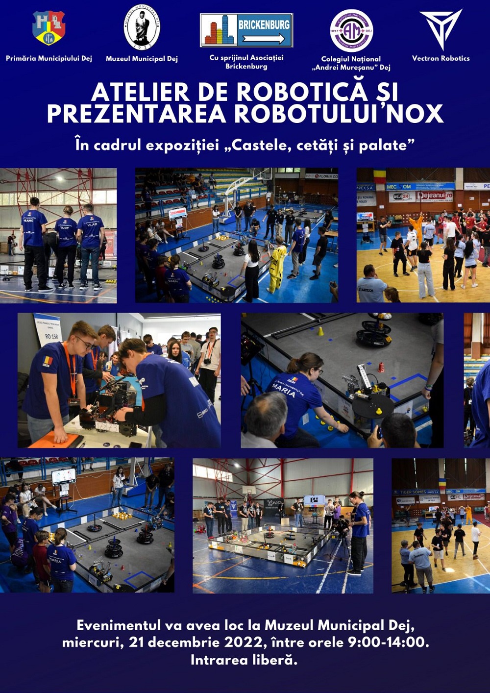 Primăria Municipiului Dej, prin Muzeul Municipal Dej, în colaborare cu Vectron Robotics, Colegiul Național „Andrei Mureșanu” Dej și cu participarea Asociației Brickenburg, vă invită miercuri, 21 decembrie, între orele 09:00 – 14:00 la un atelier de robotică și la prezentarea robotului Nox.