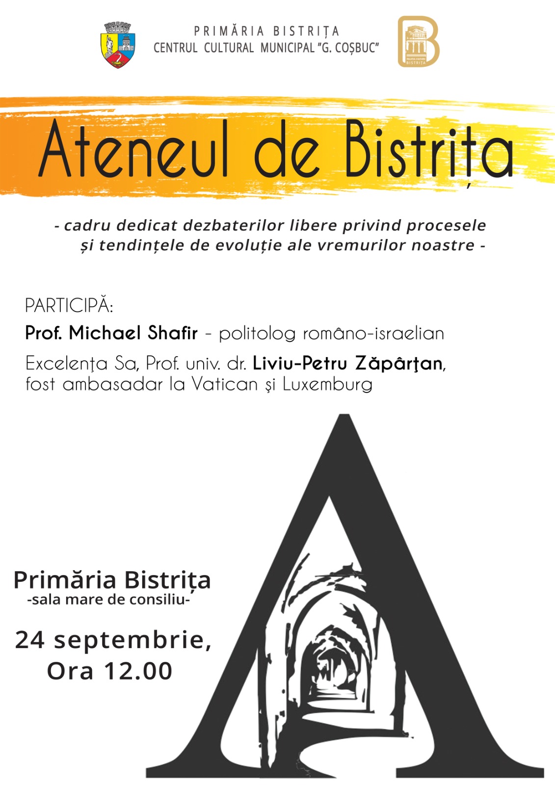 Sâmbătă, 24 septembrie, începând cu ora 12:00, în sala de consiliu a Primăriei municipiului Bistrița se va desfășura simpozionul organizat sub umbrela „Ateneului de Bistrița”, unde, alături de dl. prof. Liviu Zăpârțan, este invitat politologul româno-israelian Michael Shafir, profesor la Universitatea „Babeș-Bolyai” din Cluj-Napoca.