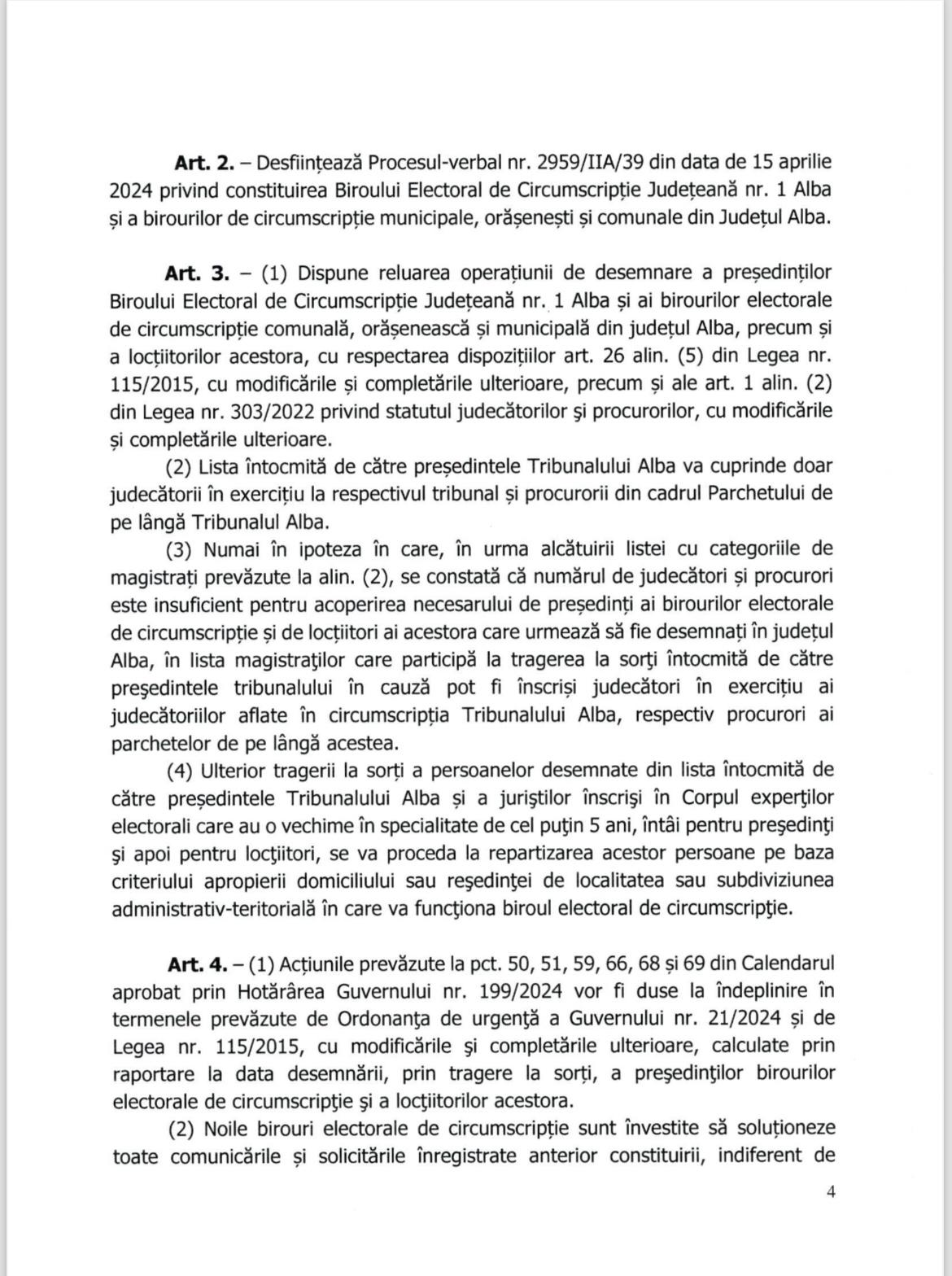 BEC a desfiintat prin Hotararea nr 34H/19.04.2024 toate birourile electorale din judetul Alba, inclusiv Biroul Electoral Judetean Alba! S-a dispus reluarea operatiunii de desemnare a TUTUROR presedintilor si loctiitorilor din judetul Alba. Prin aceasta Hotarare, BEC a constatat INCALCAREA GRAVA a prevederilor legale si a dispus masuri concrete pentru urmatoarea tragere la sorti si desemnarea corecta.Vom reveni.