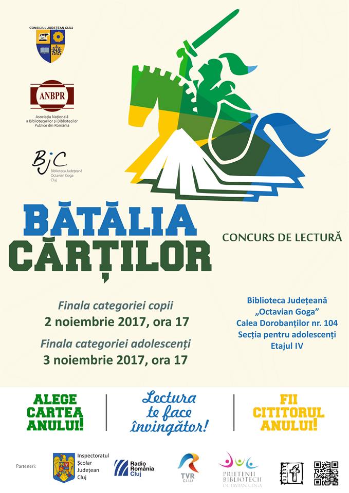 Biblioteca Judeţeană ,,Octavian Goga” Cluj, instituţie de cultură aflată sub autoritatea Consiliului Judeţean Cluj, organizează în zilele de 2, respectiv 3 noiembrie 2017, etapa finală la nivel județean a Concursului Naţional de Lectură „Bătălia Cărţilor”, ediția 2017.