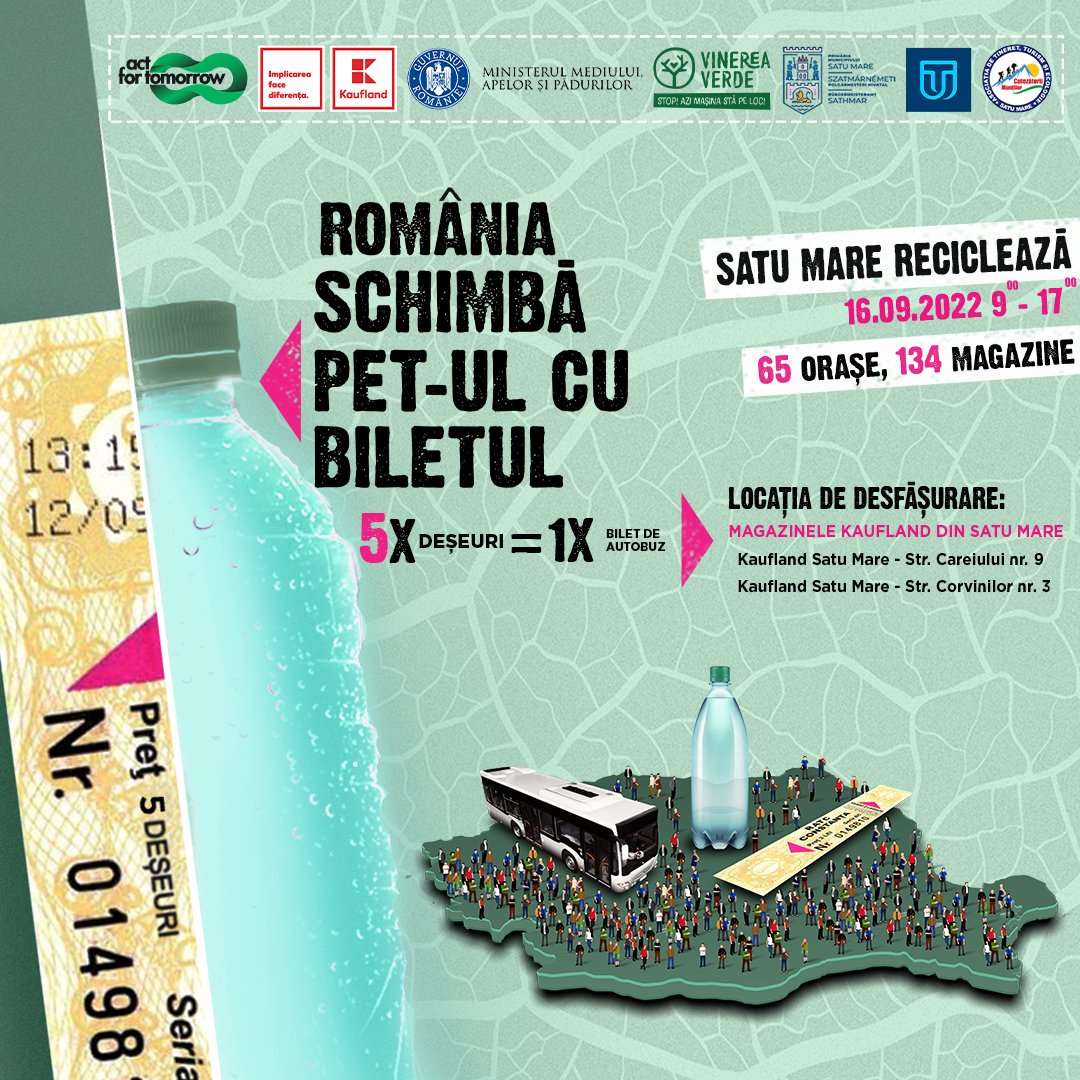 Vineri, 16 septembrie, sătmărenii vor putea intra în posesia unor bilete de călătorie valabile pe mijloacele de transport în comun, în schimbul a 5 deșeuri ( PET-uri, doze de aluminiu, sticlă). Acțiunea se desfășoară între orele 09:00-17:00, în parcările celor două magazine Kaufland Romania din Satu Mare.