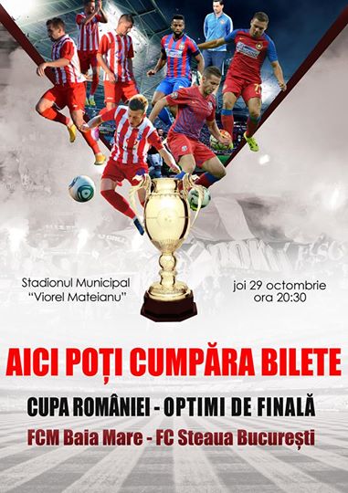 ATENTIE! Toate locurile de unde vor putea fi achizitionate biletele pentru cele doua partide vor putea fi identificate dupa afisul partidei din optimile Cupei Romaniei, dintre FCM Baia Mare si FC Steaua Bucuresti.