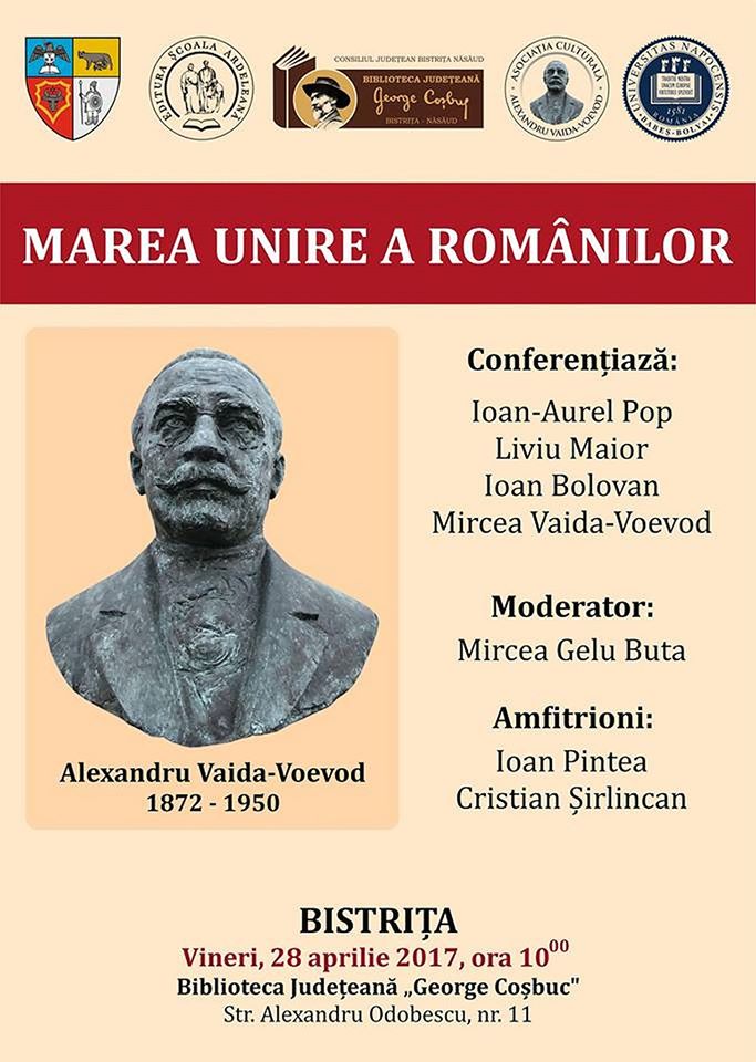 Consiliul Județean Bistrița-Năsăud, Biblioteca Județeană „George Coșbuc” Bistrița-Năsăud, Universitas Napocensis Babeș-Bolyai, Editura Școala Ardeleană și Asociația Culturală Alexandru Vaida-Voevod” organizează vineri, 28 aprilie 2017, ora 10:00, la Biblioteca Județeană „George Coșbuc” (str. Alexandru Odobescu, nr. 11), Conferința „Marea Unire a românilor”.