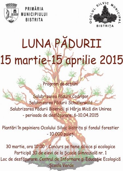 În perioada 15 martie – 15 aprilie, Primăria municipiului Bistriţa organizează o serie de acţiuni dedicate Lunii Pădurii, iar bistriţenii sunt invitaţi să se alăture celor care iubesc şi ocrotesc pădurile oraşului.