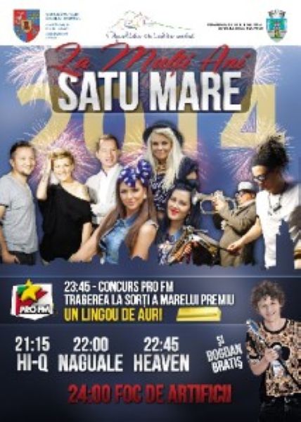 Pe scena din Piata 25 Octombrie va incepand cu ora 21:15,trupa HI Q, urmata de Naguale, si Heaven dar binenteles si Bogdan Bratis, finalistul X Factor. La ora 23:45 va avea loc tragerea la sorti a castigatorului unui lingou de aur pus la dispozitie in campania organizata in aceasta luna de ProFM, in parteneriat cu primaria Satu Mare. La miezul noptii va avea loc un foc de artificii. Pentru satmareni, organizatorii au pus la dispozitie 200 de sampanii gratis. Bugetul alocat acestui eveniment este de 100.000 de lei.