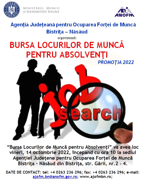În vederea participării la Bursa Locurilor de Munca pentru Absolvenţi, angajatorii pot transmite pană la data de 13.10.2022 oferta de locuri de muncă vacante, date de contact: tel. 0263 – 236 296, fax. 0263 – 236296, e-mail: ajofm.bn@anofm.gov.ro.