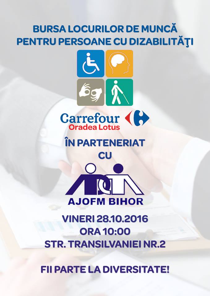 Cu ocazia zilei internaționale a diversității, AJOFM Bihor în colaborare cu Carrefour Oradea Lotus organizează Bursa Locurilor de Muncă pentru persoane cu dizabilități.