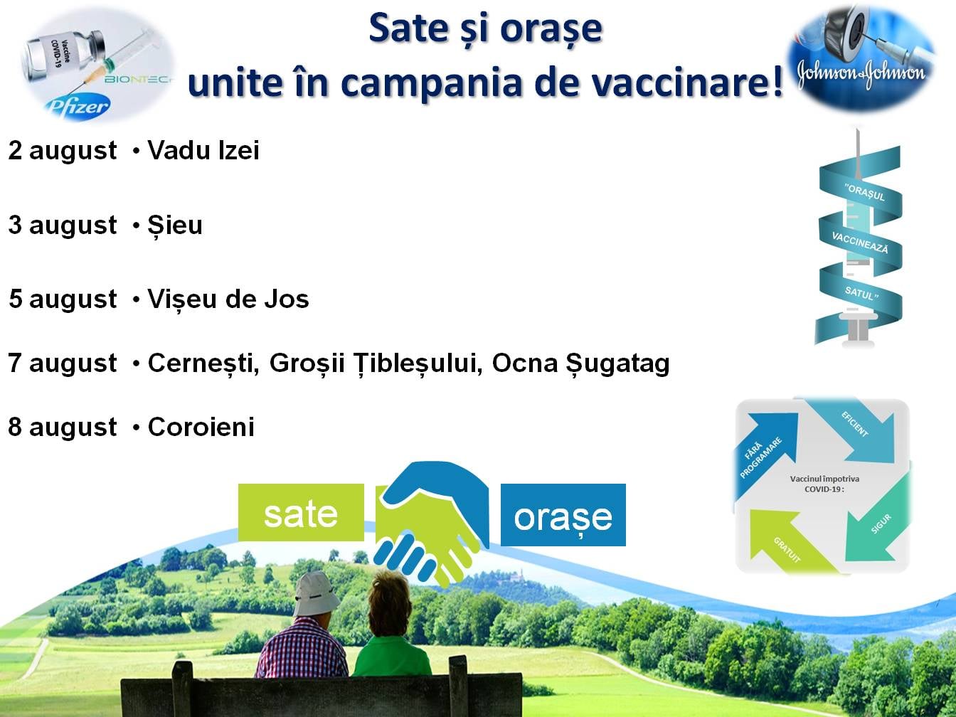 Instituția Prefectului-Județul Maramureș, Direcția de Sănătate Publică Maramureș, autoritățile administrației publice locale și echipele mobile din centrele de vaccinare de la nivelul județului, alcătuite din medici, asistenți medicali și registratori derulează în teritoriu Programul ”Orașul vaccinează Satul”. Programul se desfășoară în scopul asigurării accesului populației din mediul rural la vaccinarea împotriva COVID-19, în condiții de siguranță, eficacitate și echitate.