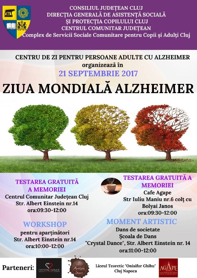 Totodată, între orele 10:00 – 12:00, la sediul Centrului Comunitar Județean Cluj se va desfășura un workshop destinat elevilor de liceu și aparținătorilor persoanelor adulte cu boala Alzheimer, urmând ca în intervalul orar 11:00 – 12:00 să aibă loc un moment artistic al Școlii de dans „Crystal Dance”.