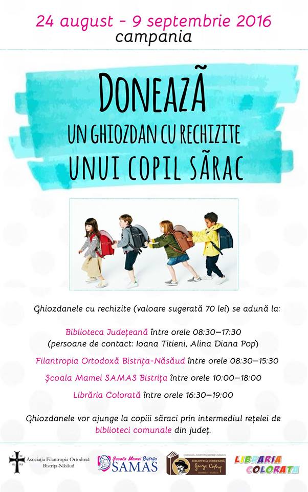 Biblioteca Judeteana Bistrita-Nasaud, în parteneriat cu Asociația Filantropia Bistrița Năsăud, Școala Mamei SAMAS Bistrița și Libraria Colorată, lansează campania DONEAZĂ UN GHIOZDAN CU RECHIZITE UNUI COPIL SĂRAC! Ghiozdanele cu rechizite (valoare sugerată 70 lei) se adună la: