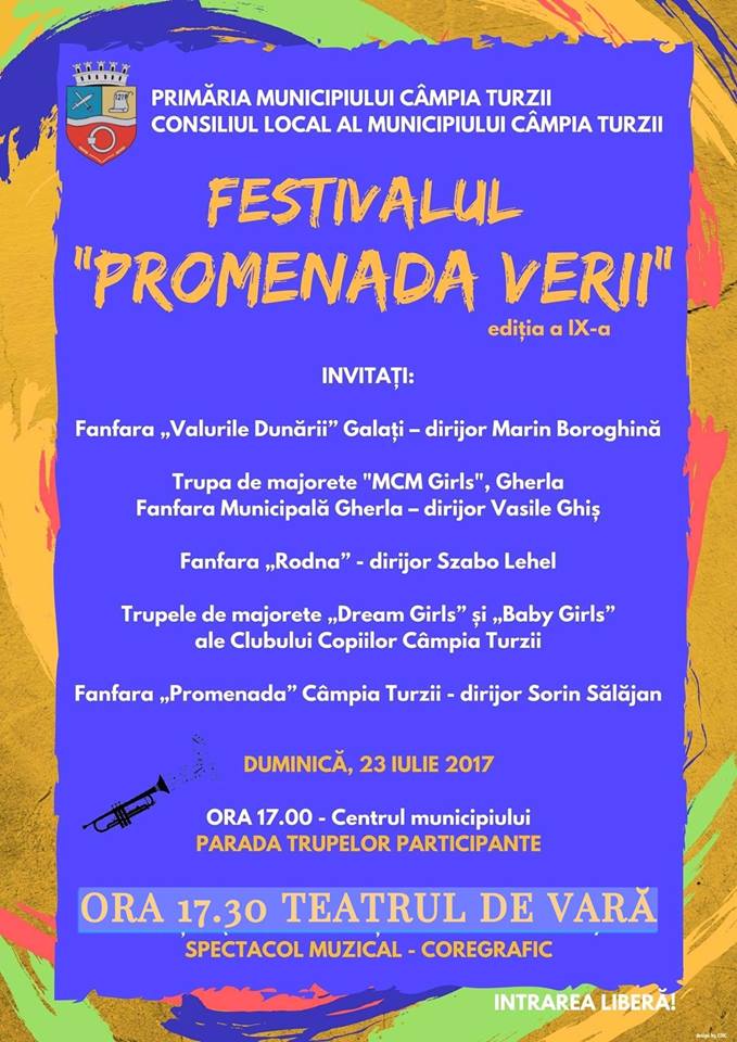 Primăria şi Consiliul Local al municipiului Câmpia Turzii, organizează în data de 23 iulie 2017, cea de-a IX-a ediţie a Festivalului Naţional de Fanfară şi Majorete „Promenada Verii”.