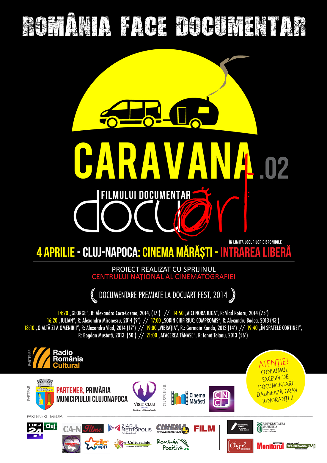 Caravana Docuart ajunge pentru al doilea an consecutiv în Cluj-Napoca la Cinema Mărăști, de această dată pe 4 aprilie, unde va proiecta filmele premiate la București Docuart Fest 2014, singurul festival de film documentar românesc. Proiectul este organizat de Asociația Docuart cu sprijinul Centrului Național al Cinematografiei.