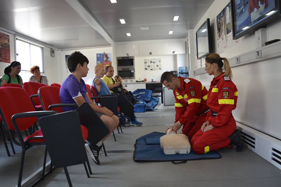 Lecții gratuite de prim-ajutor oferite in cadrul Centrului de Pregătire Mobil pentru Populație, precum și informații despre riscuri și comportamentele adecvate în situații de urgență.