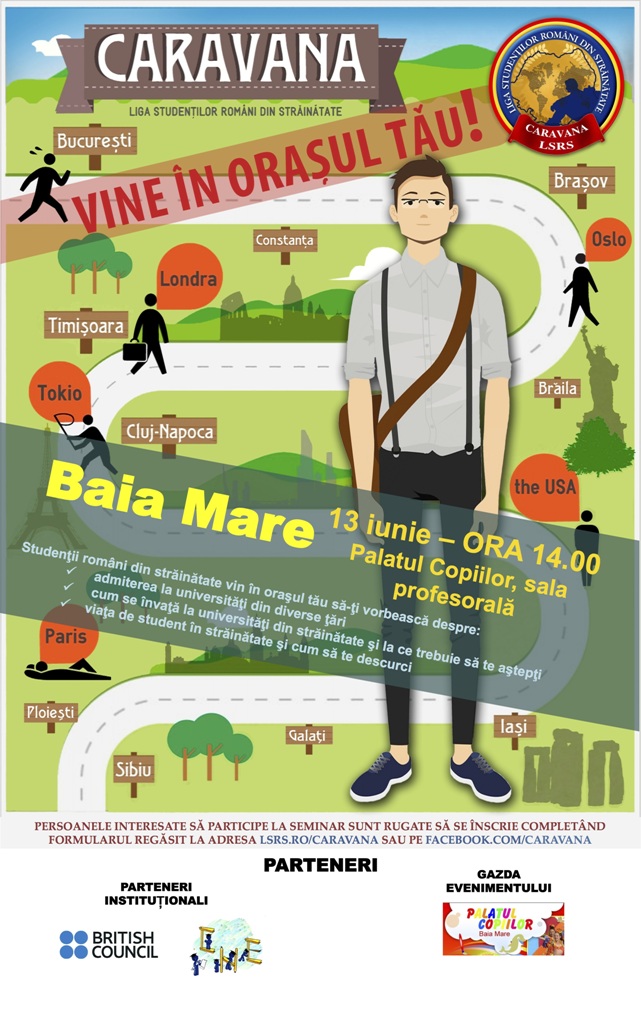 Caravana LSRS sosește în Baia Mare în data de 13 iunie 2014. Voluntari, membri și colaboratori LSRS, în calitate de moderatori, vin să se întâlnească cu tinerii interesaţi de studiile în străinătate. Seminarul va avea loc vineri, 13 iunie 2014, ora 14.00, în Sala profesorală a Palatului Copiilor.