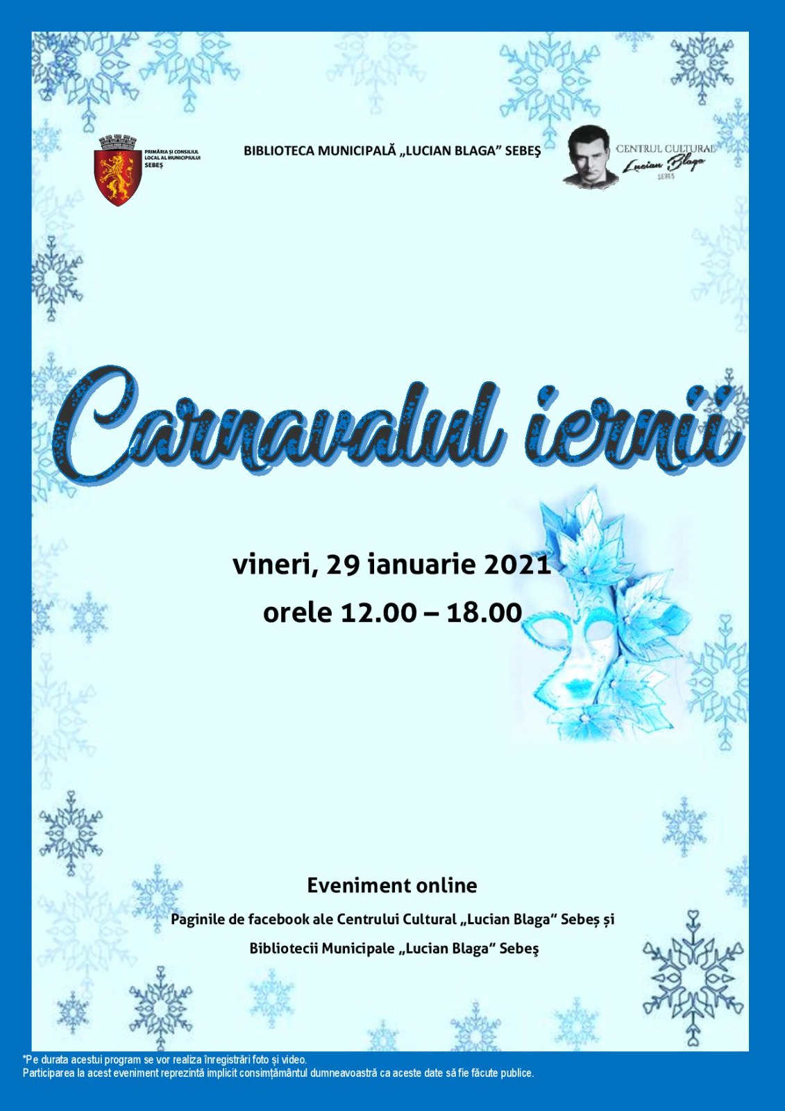 Primăria și Consiliul Local al Municipiului Sebeș, prin Centrul Cultural „Lucian Blaga” Sebeș și Biblioteca Municipală „Lucian Blaga” Sebeș au lansat, și în acest an, o invitație de suflet la “Carnavalul iernii”. Este o tradiție care s-a păstrat la Sebeș, chiar dacă, datorită pandemiei, mare parte din activități au fost transpuse în mediul online pentru a-i proteja pe micii noștri participanți.Vineri, 29 ianuarie 2021, pentru câteva ore bune, personaje din basme, povești şi desene animate celebre, cum sunt Spiderman, Batman, Elsa și Aladin, își dau întâlnire pe paginile de facebook ale Centrului Cultural „Lucian Blaga” Sebeș și Bibliotecii Municipale „Lucian Blaga” Sebeş.Prin acest proiect, ne propunem să facem mediul online mai primitor, mai prietenos, să determinăm copiii să socializeze și să se bucure de provocările anotimpului rece.Preșcolarii și elevii creativi de la Școala Gimnazială nr. 2 Sebeș (clasele pregătitoare A și B, clasele I-a B, I-a C, a II-a B, a II-a C, a IV-a C), grupa mare de la Grădinița cu predare în limba germană „Heidi” Sebeș, membrii corului ”Do Re Mi” al Centrului Cultural „Lucian Blaga” Sebeș își vor etala măștile hazlii și costumele originale, în cadrul programului nostru, între orele 12.00 – 18.00, așteptând cu emoție și nerăbdare, aprecierile (like-urile) dumneavoastră. Vă reamintim că patinoarul cu acces gratuit, amplasat în Parcul Tineretului din Sebeș, va fi funcțional până la finele vacanței intersemestriale (7 februarie 2021), accesul fiind condiționat de portul măștii de protecție și de respectarea regulilor de distanțare fizică stabilite de instituțiile abilitate să protejeze sănătatea publică. Mulțumim tuturor participanților la ”Carnavalul iernii 2021”!