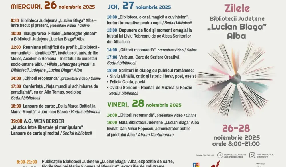 Alba Zilele Bibliotecii MIERCURI, 26 noiembrie 2025 9:30 Biblioteca Județeană „Lucian Blaga” Alba – între trecut și prezent, prezentare video /… 24 noiembrie 2025