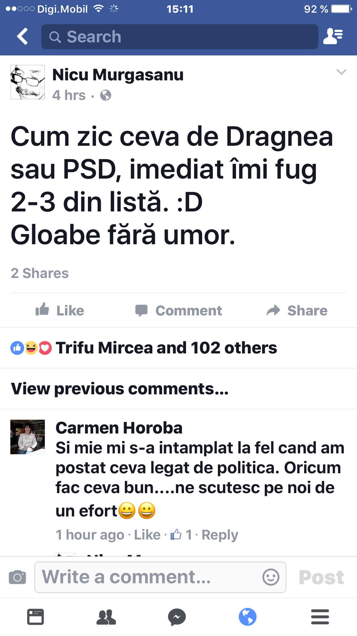 Citeam zilele acestea pe Facebook, postarea unui prieten. Sub pretextul libertatii de exprimare, Nicu Murgasanu, caci despre el este vorba, scrie: ,,Cum zic ceva de Dragnea sau PSD, imediat imi fug 2-3 din lista. Gloabe fara umor.” Este vorba, probabil, de prietenii pe care-i avea pe Facebook si care s-au plictisit sa mai fie stresati de ideile neimpartasite. Marturisesc ca m-a deranjat aceasta atitudine (si nu este singulara), venita din partea unui om pe care-l stiu, de peste 30 de ani, amabil, echilibrat, boem. Sa faci ,,gloabe” niste oameni care nu-ti mai agreeaza manifestarile verbale, mi se pare prea mult! Oare cum s-ar simti Nicu Murgasanu daca i-ar spune public si lui, ,,martoaga”, de exemplu, cineva pe care l-a scos din lista de prieteni?