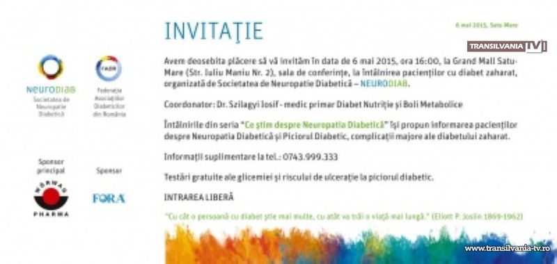 Societatea de Neuropatie Diabetică organizează în data de 6 mai 2015 ora 16:00 la Grand Mall Satu Mare, Str. Iuliu Maniu, Nr. 2, întalnirea „Ce știm despre Neuropatia Diabetică”. În cadrul acestei întâlniri persoanele cu Diabet Zaharat vor putea afla mai multe detalii despre boala lor și despre complicațiile acesteia.