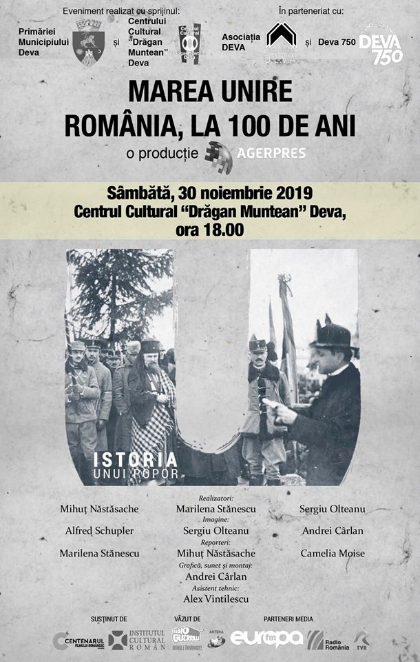 30 noiembrie 2019, ora 18:00 – „Marea Unire, România, la 100 de ani”, un documentar AGERPRES, filmat pe teritoriul României, dar şi în Bucovina de Nord şi în Basarabia.