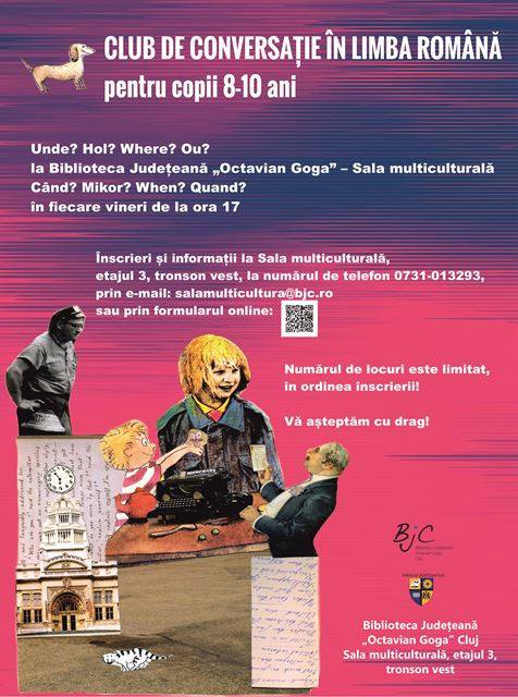 Biblioteca Județeană ,,Octavian Goga”, instituție de cultură din subordinea Consiliului Județean Cluj, informează publicul interesat, că începând de vineri, 8 noiembrie 2019, se va organiza CLUBUL DE CONVERSAȚIE ÎN LIMBA ROMÂNĂ pentru copii cu vârsta cuprinsă între 8-10 ani. Scopul principal al acestuia este acela de exersare a comunicării în limba română.