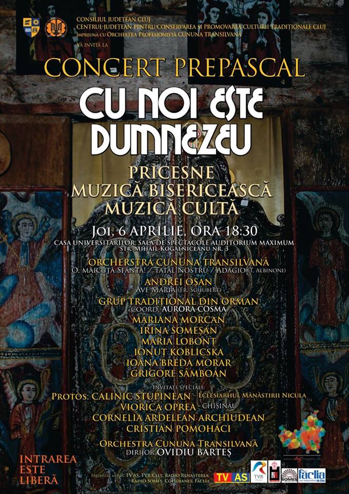 În așteptarea Învierii Domnului, Centrul Judeţean pentru Conservarea şi Promovarea Culturii Tradiţionale Cluj, instituție de cultură care funcționează în subordinea Consiliului Judeţean Cluj, împreună cu Orchestra Profesionistă „Cununa Transilvană”, organizează Concertul Prepascal „Cu noi este Dumnezeu”. Știriul va avea loc joi, 6 aprilie 2017, începând cu ora 18:30, pe scena Casei Universitarilor „Auditorium Maximum” a Universității Babeș-Bolyai, strada Mihail Kogălniceanu, nr. 3. Spectatorii se vor putea bucura de pricesne, muzică bisericească şi cultă, aduse în scenă de interpreţi de folclor, grupuri vocale şi solişti instrumentişti.