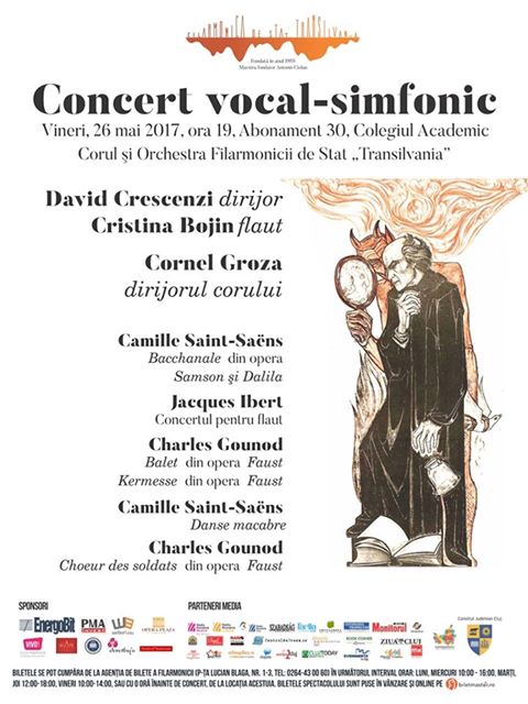 Filarmonica de Stat „Transilvania”, instituţie de cultură care funcţionează sub autoritatea Consiliului Judeţean Cluj, invită publicul interesat să ia parte la concertul simfonic dirijat de David Crescenzi, Știri ce va avea loc vineri, 26 mai 2017, începând cu ora 19.00. Pe scena Colegiului Academic va urca şi solista Cristina Bojin, care va interpreta Concertul pentru flaut de Jaques Ibert. Din programul serii mai fac parte lucrări de Camille Saint-Saëns şi Charles Gounod. Dirijorul corului este Cornel Groza.