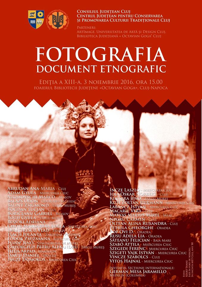 Centrul Judeţean pentru Conservarea şi Promovarea Culturii Tradiţionale Cluj, instituţie de cultură care funcţionează sub autoritatea Consiliului Judeţean, organizează vernisajul concursului naţional ,,Fotografia – document etnografic”, ediţia a XIII-a, Știri ce va avea loc joi, 3 noiembrie 2016, începând cu ora 15.00, în foaierul Bibliotecii Judeţene ,,Octavian Goga” Cluj, Calea Dorobanţilor, nr. 104.