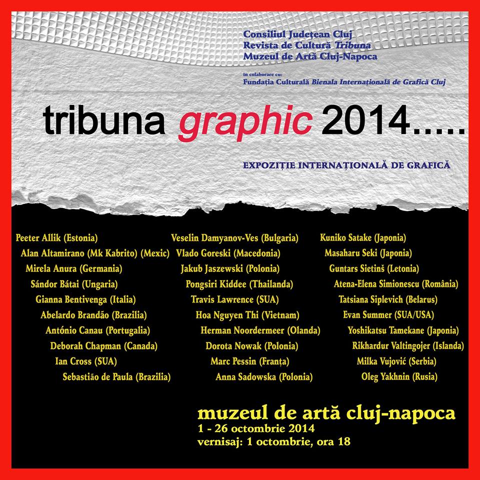 Revista de cultură Tribuna şi Muzeul de Artă Cluj-Napoca, instituţii aflate în subordinea Consiliului Judeţean Cluj, vă invită să luaţi parte miercuri, 1 octombrie 2014, cu începere de la ora 18.00, în incinta Muzeului de Artă, la vernisajul expoziţiei internaţionale de grafică contemporană Tribuna Graphic. Expoziţia va fi deschisă publicului în perioada 1-26 octombrie 2014.